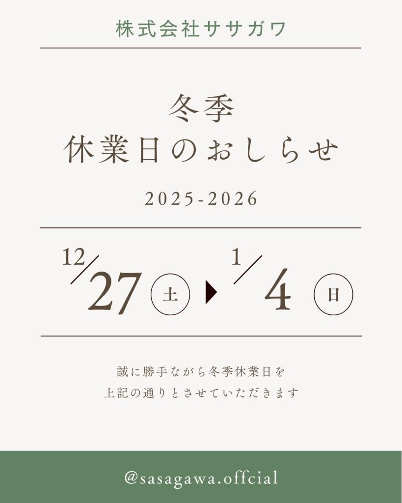 2025年12月8日 / 最終更新日 : 2025年12月10日 admin お知らせ 冬期休業日のお知らせ⛄ 2025年12月27日(土)から2026年1月4日(日)まで冬季休業日とさせていただきます。 ↓インスタグラムも更新しておりますので、ぜひご覧ください!↓ Instagram