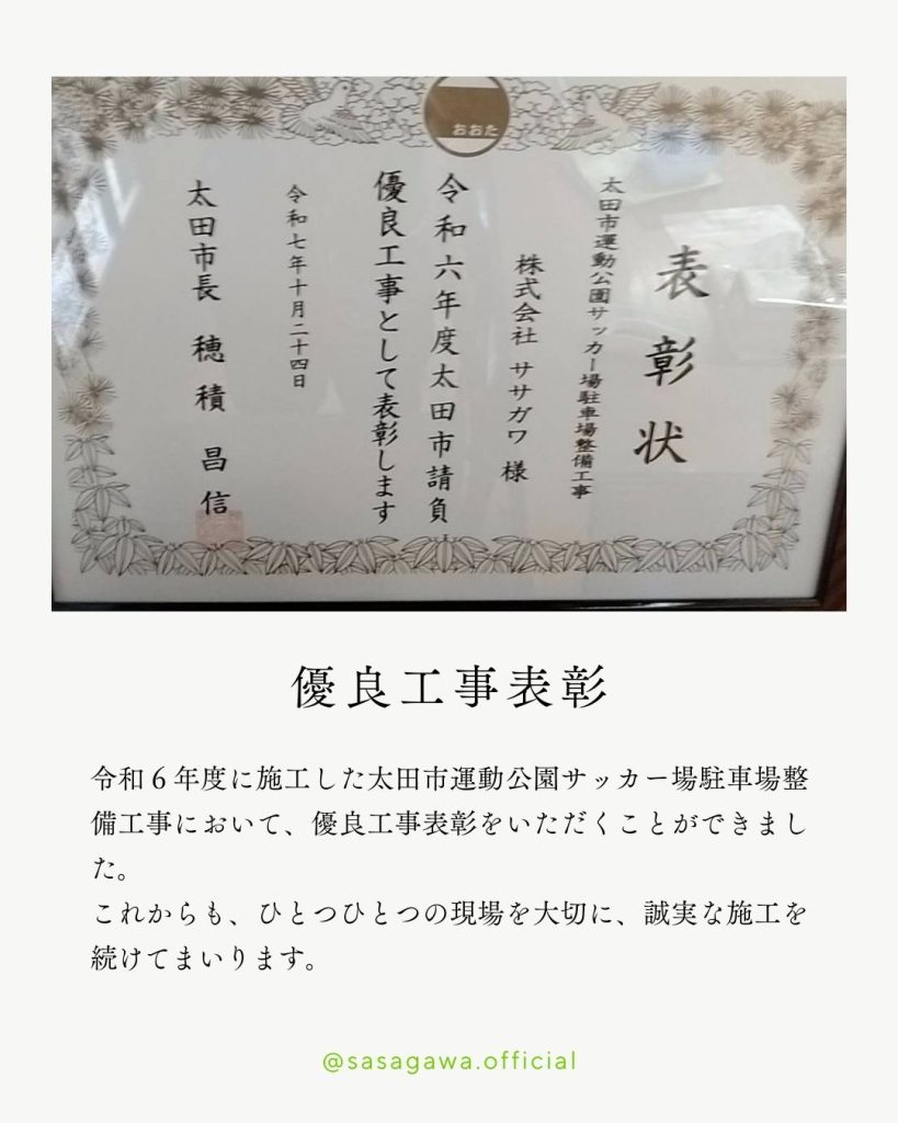 令6年度に施工した太田市運動公園サッカー場駐車場整備工事において、優良工事表彰をいただくことができました!これからも、ひとつひとつの現場を大切に、誠実な施工を続けてまいります。